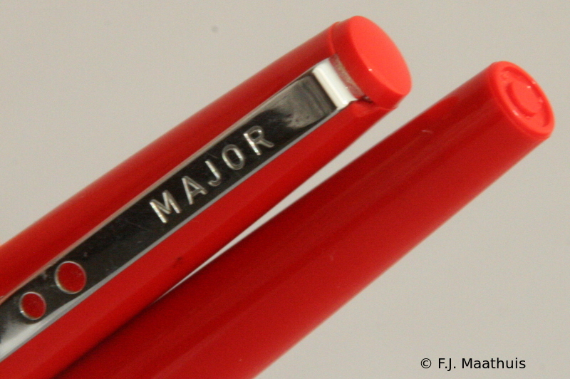 With the MAJOR junior a new model of the Major series was created. With its slim, cylindrical barrel, it is clearly different from the other models. Grip section, barrel and cap are made of plastic in the same color. The barrel is closed by an internal metal disc. The nib and ink feed are used in the same design as the MAJOR grip, but the nib always has a breather hole. A screwed-on metal disc holds the clip and closes the end of the cap. This metal disc is smooth on the top or has a flat round recess of approx. 7 mm in diameter, which may have been intended for a logo to be stuck on.