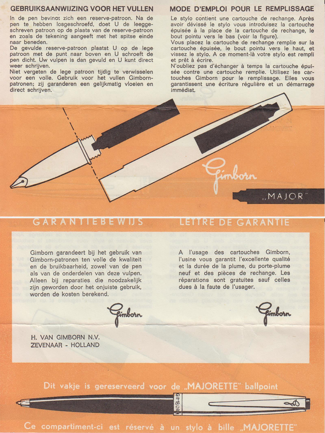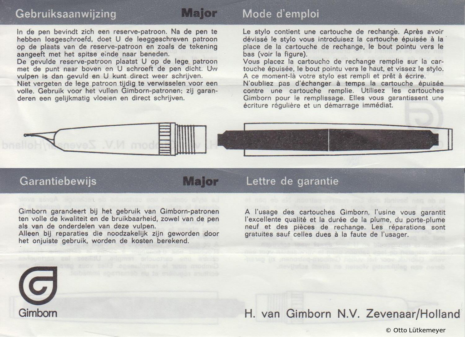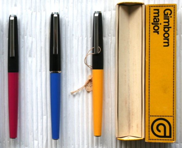 At the beginning of the 1960s, the Gimborn company introduced a Gimborn cartridge fountain pen for the first time, calling the model Major. The features of the major pens are the barrel and grip section of colored plastic, a metal cap and a tapered clip. At the beginning (variants a - c) the pen carries a curved G as a Gimborn logo; in the early 1970s this old logo is not shown anymore (variant d). The cap is matt chromed brass but with a wide polished band around its opening, which bears the engraved name Gimborn. A screwed plastic disc (in the same color as the barrel) closes the end of the cap and holds the clip in place. The hooded nib was initially well hidden but was replaced by two successive new more open nib forms. The pen was also given a continuous band ink window which shows the fill level of the ink cartridge.