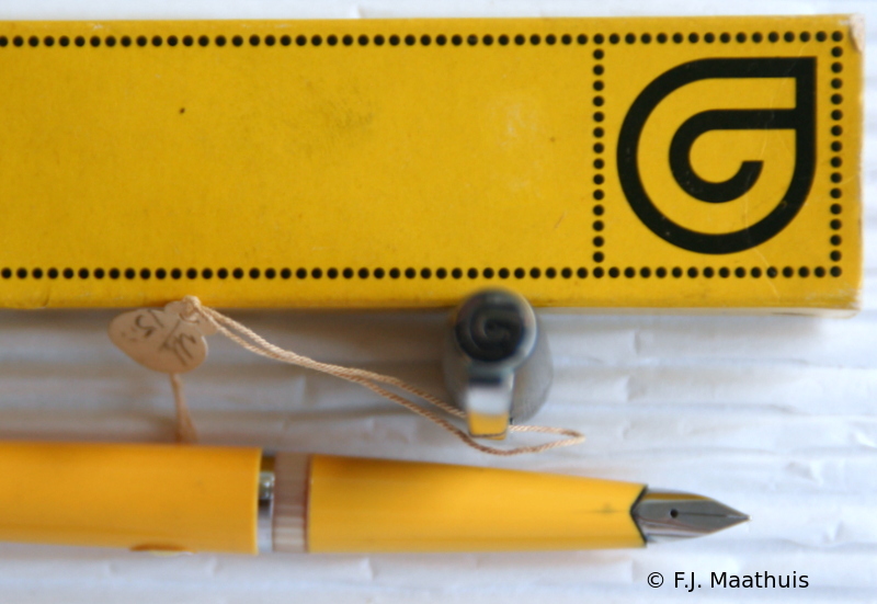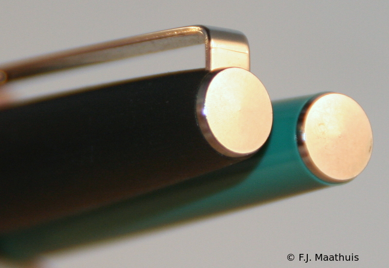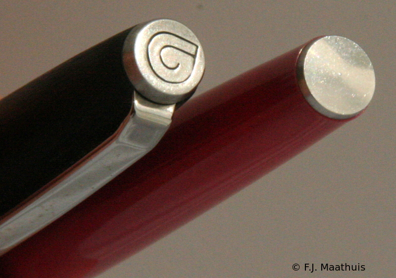The dimensions of the pen also changed over time, although the weight remained nearly the same despite a significantly longer metal cap. Why? - the thickness of the metal cap was reduced by about 2/5 so that the old and new cap weigh the same. Further changes concern the polished ring with lettering on the cap opening, a metal disc at the end of the barrel and (at the end of the 60s) the replacement of the plastic disc by a metal disc on the end of the cap. With the introduction of the new stylized G as a new company logo around 1969, the curved G is missing on the clip and the new logo appears at the end of the cap, instead.