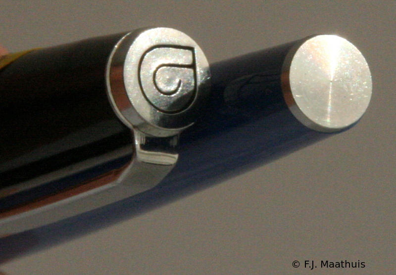 Similar to the Major GLS model, the Major GL has a cap made of nickel silver with a 'hammered' surface texture (variant a). The barrel and grip section are made of matt plastic in four different colors. The ending is closed by a metal disc. The cap end is closed by a metal disc which carries the stylized logo G and holds the clip, which is completely plain, with no engraving.