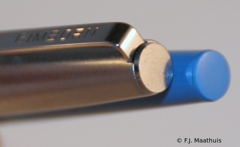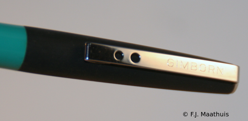 Chrome-plated metal cap without lettering at the cap opening. New bar clip with 'GIMBORN', without logo at the end of the cap. The grip section and barrel have the same color. Screwed metal disc at the end of the barrel.