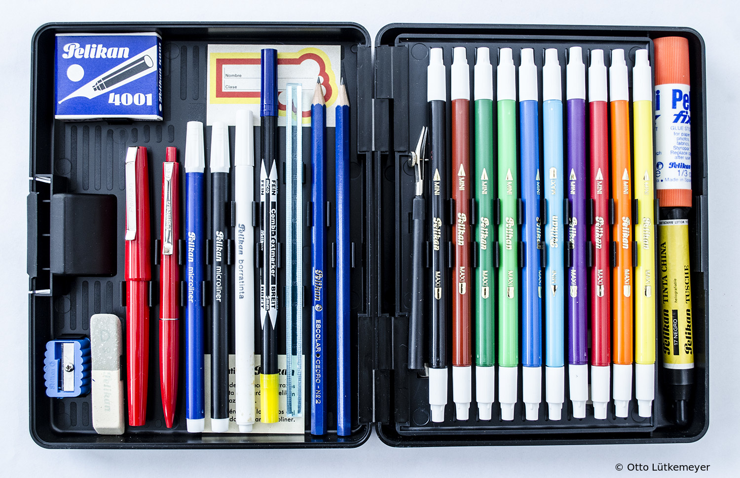 Also from the time of Laurin made school pencil cases that contain writing utensils and other writing equipment for school use. The pencil cases are made of unbreakable hard plastic. Elastic attachment clips facilitate the proper filling of these boxes. Numerous model variants were available in different colors and configurations. Thus, e.g. the models EE / 20, E / Luxe, E / 2010, ET / 2000, ET / 2020, ET / 2500 and ET / 3000 each have a simple fountain pen with permanent nib.