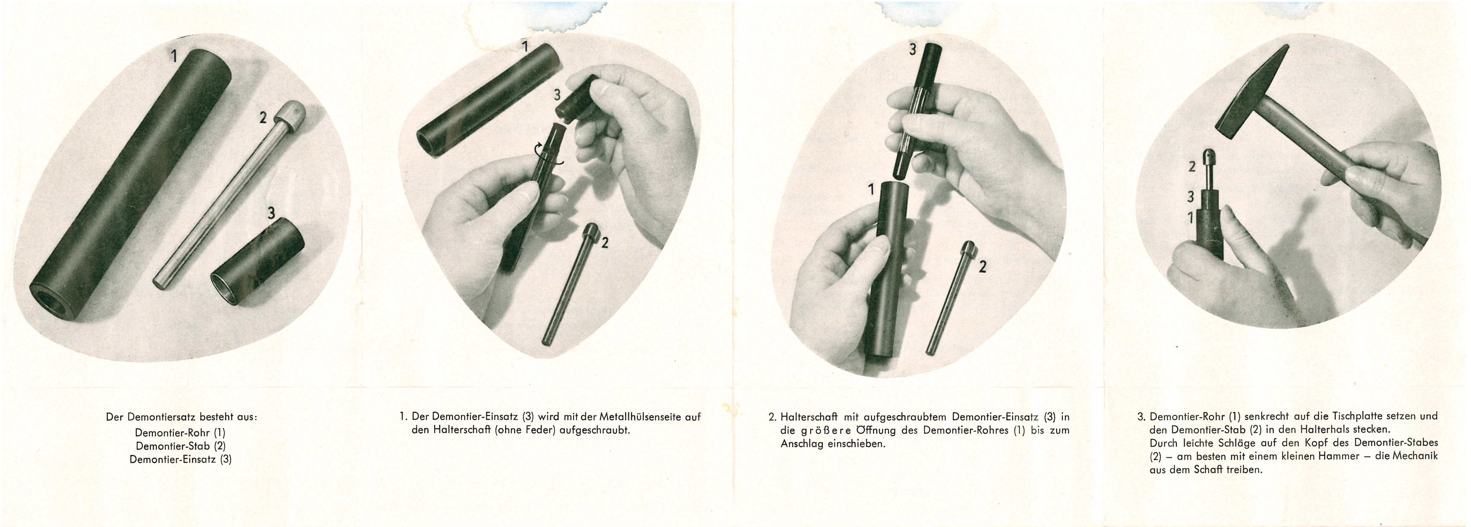 The dismantling and reassembling of this pencil has to be done in a defined order, therefore this guide was offered. It was found in the repair box shown above. Maybe it will help some users and collectors of this unique pencil.