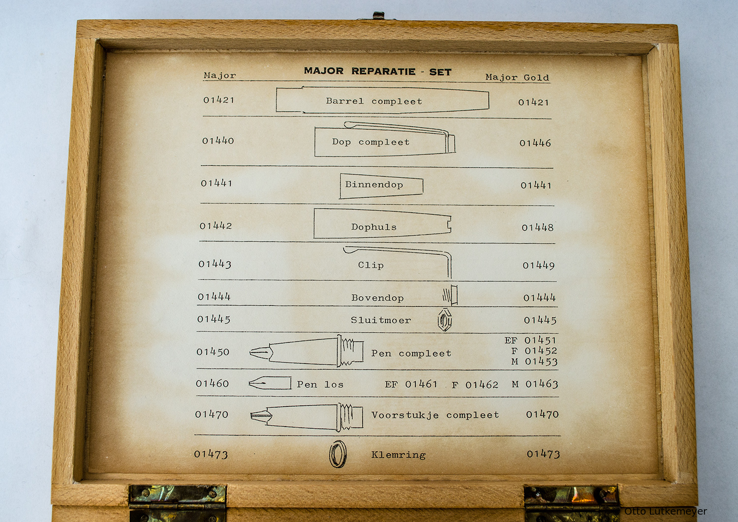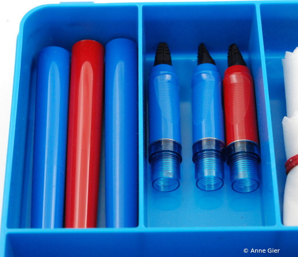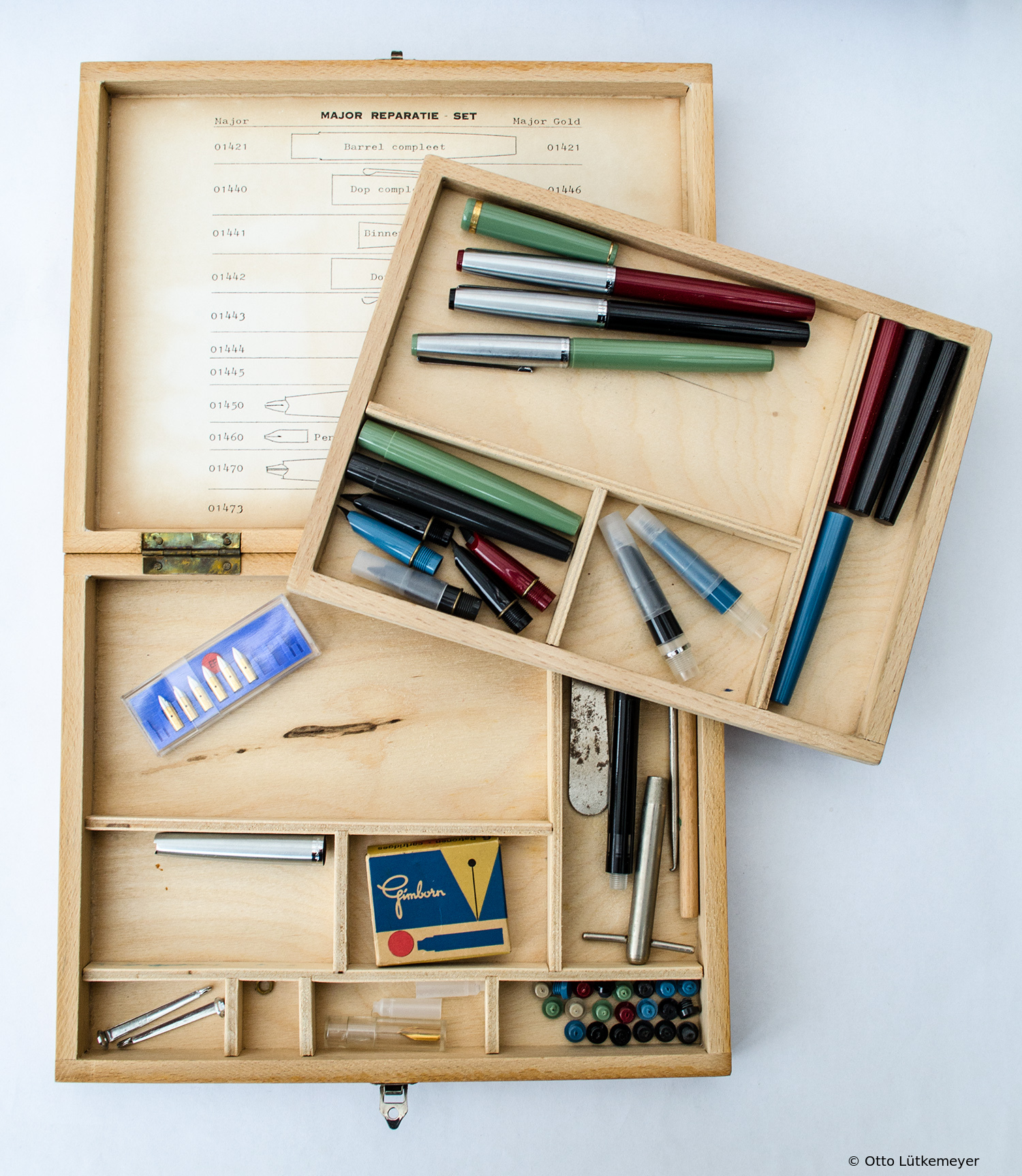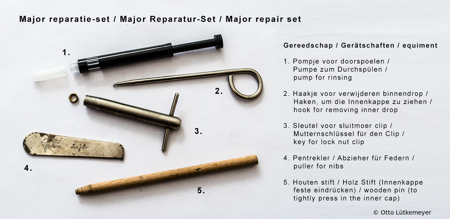 Below is a repair kit designed for the Gimborn Major (1st Series) and Major Gold models in the early 1960s. This includes in particular the necessary tools for the exchange and fitting of caps with a colored cap top and the clip, which could be tightened / loosened by a nut with a special key.